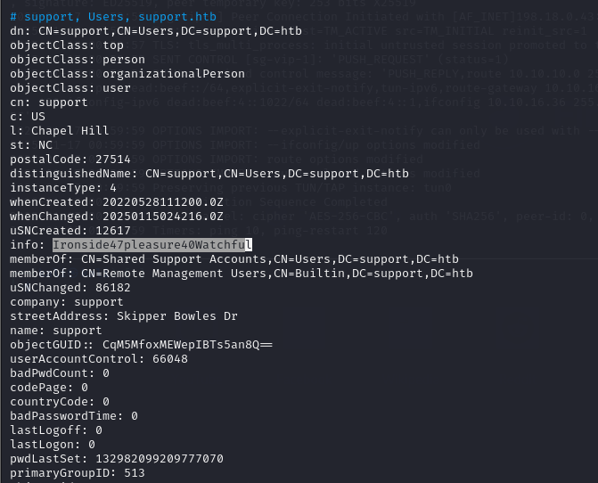 389/tcp open ldap Microsoft Windows Active Directory LDAP (Domain: support.htb0., Site: Default-First-Site-Name)